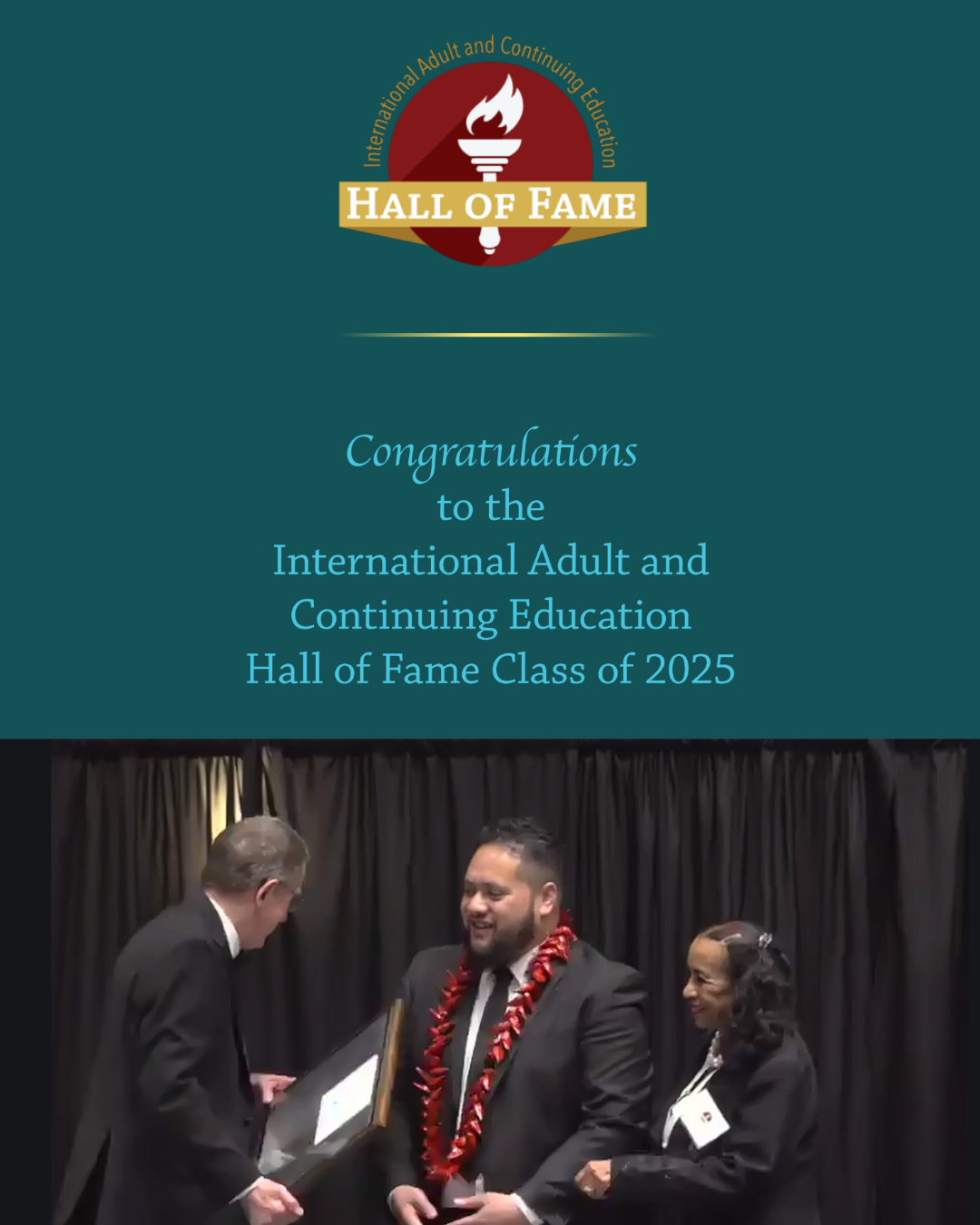 Agradecemos sinceramente al Comité del Premio del Salón de la Fama Internacional de la Educación de Adultos y la Educación Continua por este honor y reconocimiento».