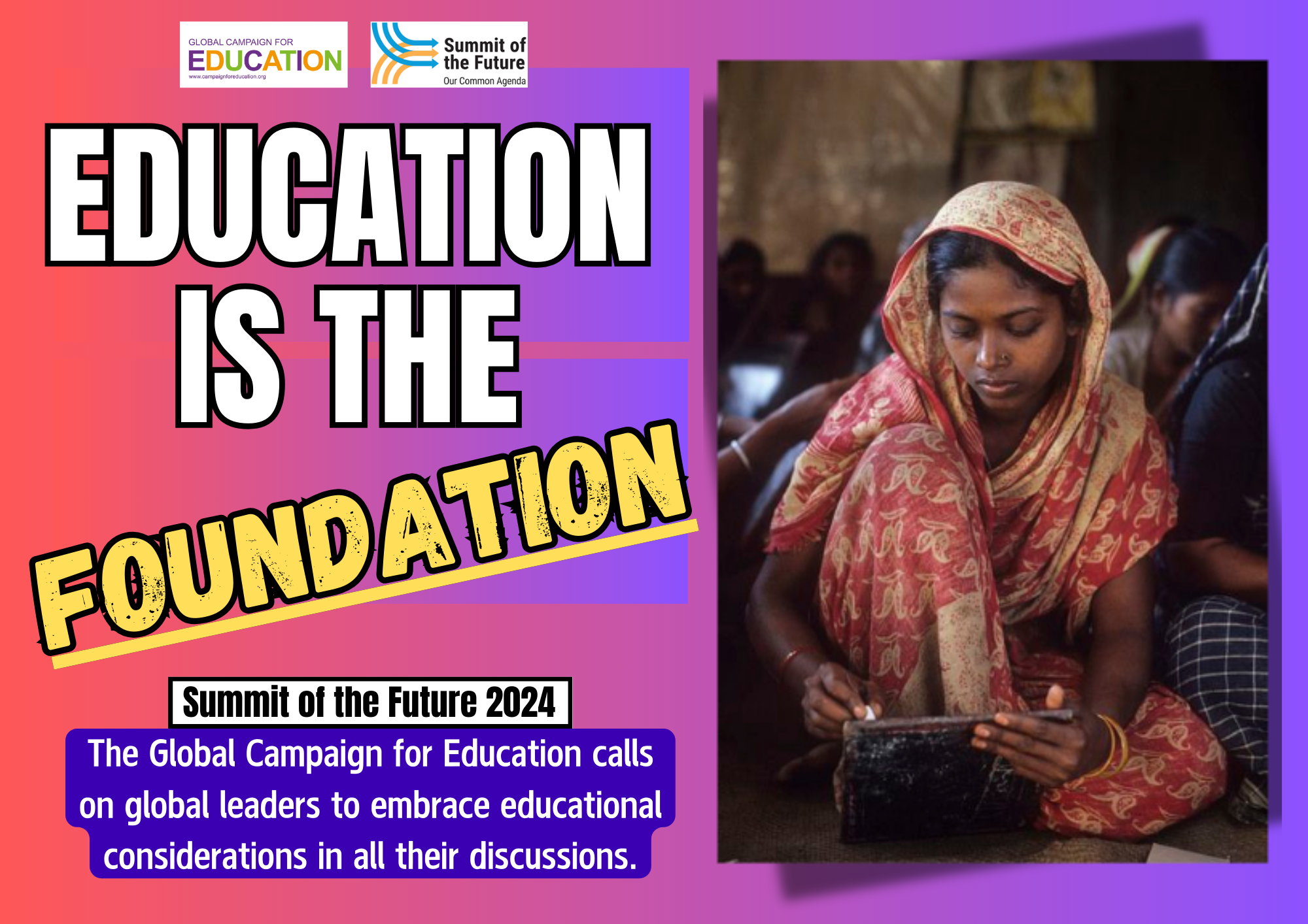 Desde el anuncio de la Cumbre del Futuro (SOTF), la Campaña Mundial por la Educación ha reconocido la importancia de la iniciativa y ha instado a los Estados miembros de las Naciones Unidas, en especial a los representantes de Namibia y Alemania, facilitadores del evento, a incluir compromisos sustanciales en materia de educación y aprendizaje a lo largo de toda la vida, reconociendo su potencial transformador para las generaciones presentes y futuras.